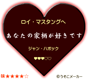 | 司令室の扉を開けた途端フュリーの机の周りに群がる部下たちの姿が見えてロイは眉を顰める。たいていの場合、彼らがああやって群れている時はろくなことをしていないと判っていながら、ロイは好奇心に負けてその群れの中に顔を突っ込んだ。 「何を騒いでいるんだ?」 「ああ、大佐」 ひょっこり顔を出した上司にフュリーがニコニコと答える。 「バレンタインメーカーって言うゲームなんですけど」 「バレンタインメーカー?」 そう言えば今年はまだチョコを貰ってないぞとチラリとハボックの顔を見れば空色の瞳がさり気なく逸らされる。そちらへの追求は後でするとして、ロイはフュリーの顔を見て続きを促した。 「送り手と貰い手の名前を入れるとどんなチョコレートを送るかが判るんです。大佐もやってみます?」 「面白そうだな、是非やってみてくれ」 フュリーの言葉にロイが嬉々として答えれば空色の瞳が嫌そうに歪められる。ロイはそれに気付かぬフリでフュリーにやってくれと促した。 「ええと、ロイ・マスタングから……ハボック少尉、ですよね?」 「当然だ」 何でわざわざ聞くんだという顔をするロイにフュリーは慌てて名前を入力する。そうすれば現れたチョコレートに皆の目が吸い寄せられた。 ジャン・ハボックへ 大 本 命 ロイ・マスタング 「おお、素晴らしい!まさしくそのとおりだッ!!」 現れたチョコを見てロイが満足げに頷く。ニヤニヤとブレダに「よかったなぁ」とつつかれて複雑な顔をするハボックにフュリーが言った。 「ハボック少尉の分もやりましょうか?」 「えっ、いや、オレはいいよ」 やってみたら絶対ろくな事にならない気がする。そう思ったハボックが慌てて手を振ったがその手を押さえてロイが言った。 「頼むよ、フュリー曹長」 「いいってば、フュリー!」 二人の違う言い分を聞いて、だが身の保全を考えたフュリーは当然ロイの願いを聞き入れる。さっきと差出人と受取人の名前を入れ替えて入力すれば現れたチョコに一瞬皆が凍りついた。 ロイ・マスタングへ あなたの家柄が好きです。 ジャン・ハボック 「ハボック…そういうことだったのか?」 「ちょ…っ、たいさっ、遊びでしょ、これは!」 「いや、お前の潜在意識がパソコンに影響してだな」 「んなわけあるかッ!!」 たかが遊びに目くじら立てて迫ってくるロイに、やっぱりろくな事にならなかったとゲンナリするハボックだった。 09/02/14 |