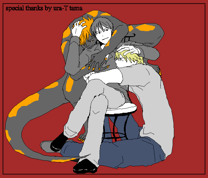 擬人化サラマンダー(大佐の守護精)とハボが大佐を取り合い。 サラマンダーがハボマンダーってのが最高で!! ニヤリと笑うハボマンダーと挑むように見つめるハボックが〜〜。いいなぁ、両手にハボックvv 大佐はどっちのハボも溺愛しているそうですよ、うふふvvv 本当は全部載せたいけどそういうわけにもいかないので(苦笑) しかし、全部で32枚、リク受け付け締め切りがハボックの日で、アップが二周年の8月25日。 この短い期間にリクこなしてしかもそれが全部素晴らしいって……神だ! 是非是非ご覧になりにサイト様へお出かけください。一見の価値大ありです!! たまさま、幸せな素敵イラスト、本当にありがとうございましたーーーーッッ!! |