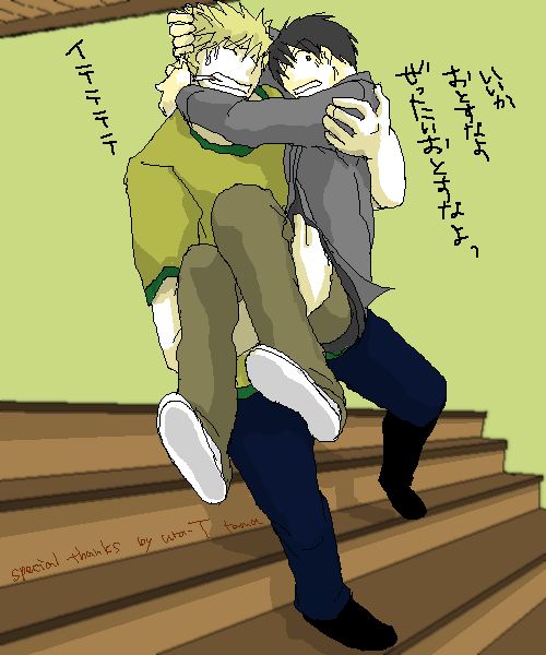 | 「ura-T」さまの二周年企画で「一枚カラー絵イラストリク受け付けます」という素敵企画をやっておられまして、 しかもリクした絵は勿論、他の方のリクもお持ち帰り自由という太っ腹企画! 正直コメントも入れさせて頂いた事もなく、いきなりリクはどうよ、と思わないでもありませんでしたが ここでリクしなかったら一生後悔する!と思い切ってリクさせて頂きました。 お願いしたリクは「黒ハボで目の見えないロイを頑張って姫抱っこする脚の悪いハボ。グラッとこけそうになって必死にしがみつくロイ姫希望」 んで、描いて頂いたイラストがこれだ!! |