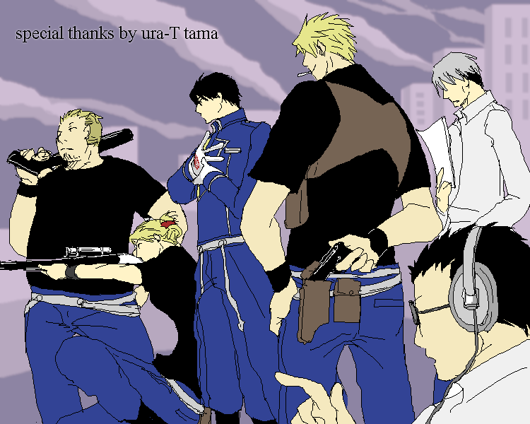 | 増田組戦闘態勢!! いやもう、カッコいいーーーーーーッッ!!ハボの背中がタマランッ!! 大佐は勿論ですがファルマンとフュリーもきりりとしてて、うふふふふ。 そっかー、増田組かぁ、その手のリクもよかったなぁと思いつつ、他の方のリクで幸せお裾分けしてもらったりv |