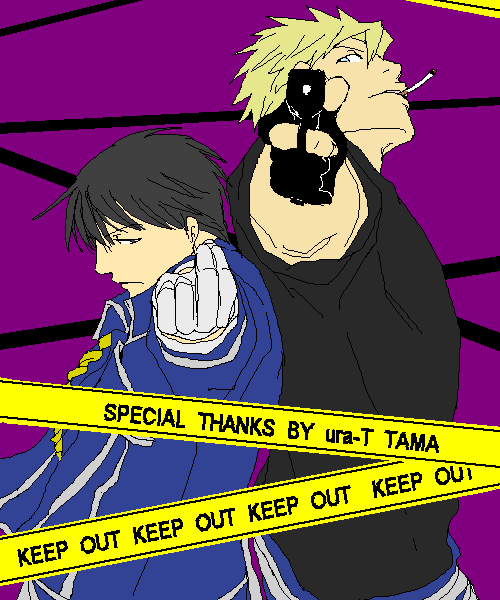 | 背中合わせハボロイ。 グハーッ!!ちょっともう、カッコよすぎて死にそう!! 背中合わせって萌えツボですよね。 うふふ、背中を任せられるのは互いしかいないってvv 黄色いテープがまたいいなぁとv |