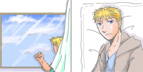 あああ、ハボック〜〜〜ッッ!! グッと拳を握り締めるハボックにズッキュンして思わず小話錬成してしまいました(苦笑) 「わりィ、ちょっと躯起こして貰えるか?」 エルリック兄弟を見送って病室に戻ってきたフュリーにハボックが言う。 メガネの奥の目を一瞬見開いたものの、フュリーは黙ってハボックに手を貸した。 「大丈夫ですか?辛くない?」 体を支えやすいよう、背中に枕を当ててフュリーが聞く。 それに頷いて「サンキュ」と呟くとハボックは窓の外へ視線を向けた。 そのまま何も言わずに外を見つめるハボックを見て、フュリーは林檎を剥いてくると病室を出ていく。 それには答えず、外を見つめ続けるハボックの耳に静かに扉が閉まる音が響いた。 ハボックは暫くの間外をじっと見つめていたが、やがて腹の底から息を吐き出す。 太く長く吐き出した息は今までハボックが胸の奥底に溜めこんでいた諦めや絶望をも外に出したようだった。 「まったく……15の子供に気付かされるとはな」 ハボックは苦笑してそう呟く。すっかり諦めに慣れ切っていた自分が恥ずかしかった。 「何もしてないうちから諦めるなんて」 こんな自分を見たら彼は何と言うだろう。 きっとあの黒曜石に怒りと軽蔑を宿して自分を見るに違いない。それだけは耐えられそうになかった。 「負けてらんねぇ」 ハボックはそう呟いて未だこれだけは自由になる手を握り締める。 握れば手首から腕へと筋肉が引き締まるのを見て、ハボックは唇の端を持ち上げた。 「まだやれる事は幾らでもあるじゃねぇか」 そう言って見上げる先に広がる青い空。 「アンタがあそこまで駆け上がるなら絶対追いついてみせるから」 言い切るハボックの顔には、かつての不敵な笑みが戻っていたのだった。 いやあ、色々妄想混入してますが(苦笑) 絵チャにお邪魔するのは久しぶりだったのですが、 やはりハボックで盛り上がれるのはとっても楽しいv 11.5巻で大騒ぎ出来たのも嬉しかったですーv 遊んで下さった葉月さま、柚木さま、楽しい時間をありがとうございましたvv 一度このページをアップした後、 「映画グッズでQPロイがあるのにQPハボがないのは不公平」と 落書きで葉月さまが描いていらしたQPハボックも「載せたかったなぁ」とワガママ申しましたら (落書きなのでログがのこってなかったので) 葉月さまが新たに描いて下さりましたーーーッッ!! |