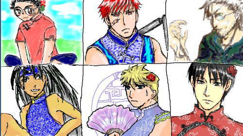 そして次のお題は「チャイナ服」 フュリー/和崎さま、 ジョイ(オリキャラ)/古賀さま、 ヒューズ/SINさま エンヴィー/りょうさま、 ハボ/葉月さま、 ロイ/坂下さま フュリー、チャイナ服が凄い自然です。とってもカワイイv頭の花も違和感なし(笑) ジョイvvカッコいい〜〜〜っっvvv改めて惚れ直しましたっv ヒューズ、渋いです、ステキですvこんなヒューズなら惚れるって思いましたv エンヴィー、りょう様、絵チャでお絵かき初めてとは思えぬ素晴らしさです。脚がいかにもエンヴィーっぽくてv 次回も期待してますvv ハボ、うふふふふ、カワイイ〜〜〜vvいやん、是非全身で見たかったなぁ。 「ドレス」を引き当ててくださった葉月さまに感謝です(笑) そしてロイ!美人だっっvvvメチャメチャ美人だ〜〜vvちょっと照れてるロイが最高にステキです。 是非スリットから覗く脚が見たかったっ! でもってまたもや欲さまと小話させていただきました。いつもステキなお話に導いてくださる欲さま、凄いです。 そうして今回もあっと今に3時になってました。ホント楽しい時間は過ぎるのが早いです。 正月らしく華やかな絵が続いて本当に眼福v最高のお年玉でした。 今回も楽しく遊んでくださった皆様、本当にありがとうございましたv そして葉月さま、大盛況でお疲れ様&ありがとうございましたv |