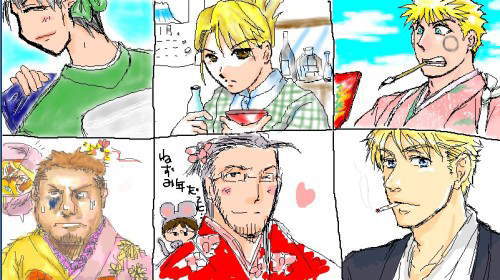 次のお題「キモノ」でついた条件が「男女逆キモノで」相変わらずのイロモノだ(笑) ファルマン/和崎さま リザ/葉月さま ハボ/古賀さま ブレダ/SINさま ヒューズ/りささま ハボ/坂下さま ハボが二人になったので坂下さまのみ男キモノバージョンになってます。似合うっ!メチャカッコいいvv ファルマン、緑のキモノがとっても似合ってます。妙に楽しげなのがファルマンっぽいっかなって。 さすがファルマンスキーな和崎さまv 葉月さまのリザ、男前だっ!「紋付じゃなくて書生にしてしまった」と仰ってましたが、 書生姿でもカッコいいです、リザ姐さんっv 古賀さまにはソッコー「女キモノハボ」のリクが行ってました(笑)ピンクの娘キモノ、メチャクチャ似合いますvv ほっぺの丸印がカワイイなぁ(うっとり) SINさまのブレダ。「誰でも描けます」と仰ってた言葉の通りブレダをサラサラ〜っと。凄いです! 黄色とピンクのキモノが妙に似合っていて、最高ですーv そしてりささまのヒューズ。どうしてこう、イカれた格好(失礼)が似合うんだろう…。 短い時間でサラサラと描いて尚且ついかにもヒューズっていう表情が凄いです。後ろのネズミロイもかわいいv 絵にあわせて「どうしてロイがいないのか」をネタに欲さまと楽しく掛け合い小話をさせていただきました。 (文字ログは「月とサカナとココナッツ」さまで掲載されてます。) |