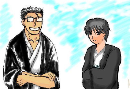 お邪魔しましたところ、葉月さまと古賀さまが早速お絵かきされてました。 おお、お正月〜〜vv似合うなぁ、和服、2人ともv |
