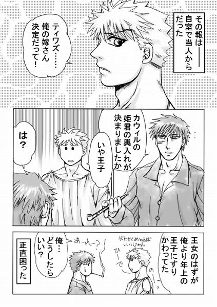 | 拍手リクss「ハイムダール国物語」に出てくるハボの教育係「ティワズ」のモデルは、ハボロイサイト 「ファイアーズ・プラン」の古賀恭也さまが描くところのジョイです(性格は大分違いますけども・苦笑) ジョイ激惚れの管理人は図々しくも勝手にモデルとして萌え萌えした挙句、 古賀さまに「ティワズなジョイが見た〜〜いっ!」などと叫んじゃったりしていたのですが、 そうしましたところ古賀さまがこんな素敵な主従小話を描いてくださりました!!! |