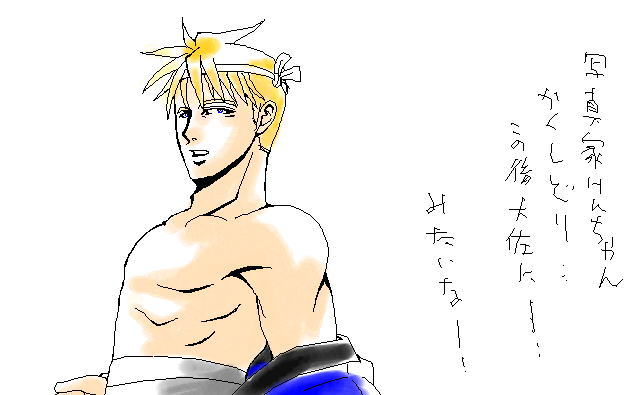 正義さまによる「お祭男ハボ」vv 褌ですぜ!神輿ですぜっ!! 褌で桃尻曝すなと大佐に怒られるんだそう(笑) この後神輿に乗ったハボにどさくさ紛れにタッチしようとする有象無象を 大佐とハボ親衛隊が必死に排除するという血みどろの戦いが繰り広げられたとかなんとか…。 写真屋ケンちゃんが命を賭して撮った写真はネガもろとも大佐に奪われたそうだし いやもう、すんごい祭になりそうですよね(笑) |
