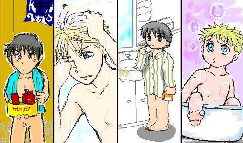 左からりょうさま、坂下さま、葉月さま、古賀さま いやー、どのハボもロイもメチャクチャ可愛いですっ! 一人で入れるよ、と男湯に向かうロイ。お母さん、タオルで隠す事を教えてあげてください(笑) シャンプーが目に入っちゃったハボは涙目で激萌えv 歯磨きロイのパジャマの下はハボが持っているそうな。こんな子供の時から分けっこですかぁ(笑) そしてツルンな子ハボはシャボン玉に夢中ですv |
