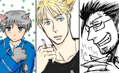 左から葉月さま、坂下さま、古賀さま にゃんこロイは機嫌を損ねてしまったハボにごめんなさいでネズミのプレゼントをするのですが、 ハボに「バッチイから捨てなさい」とポイッとされてしまい涙目で逃走するのだとか(笑) わんこハボ、犬なのにドッグタグつけてる!(笑) やーん、こんなワンコなら絶対飼いたい〜〜vv そしてヒューズ!! 狼?!悪魔の間違いじゃ?!(笑) このヒューズに果たしてハボは「娘(ろい)さんを下さい」と言えるのか?!と言う話題になり 5メートルくらい離れたところから言ったものの、ヒューズに「ああ?聞こえねぇなぁ」と返されると(笑) 頑張れ、ハボ!! |